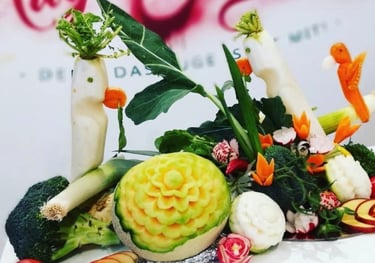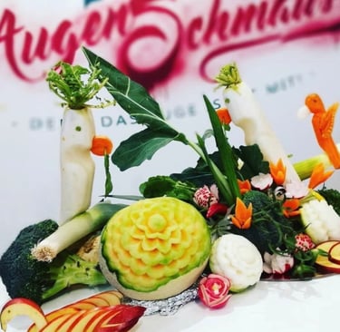 Ebenfalls das Obst und Gemüseschnitzen finde ich ein persönliches Highlight. Wer möchte nicht gerne mal in eine Wassermelone eine traumhaftschöne Blume schnitzen?